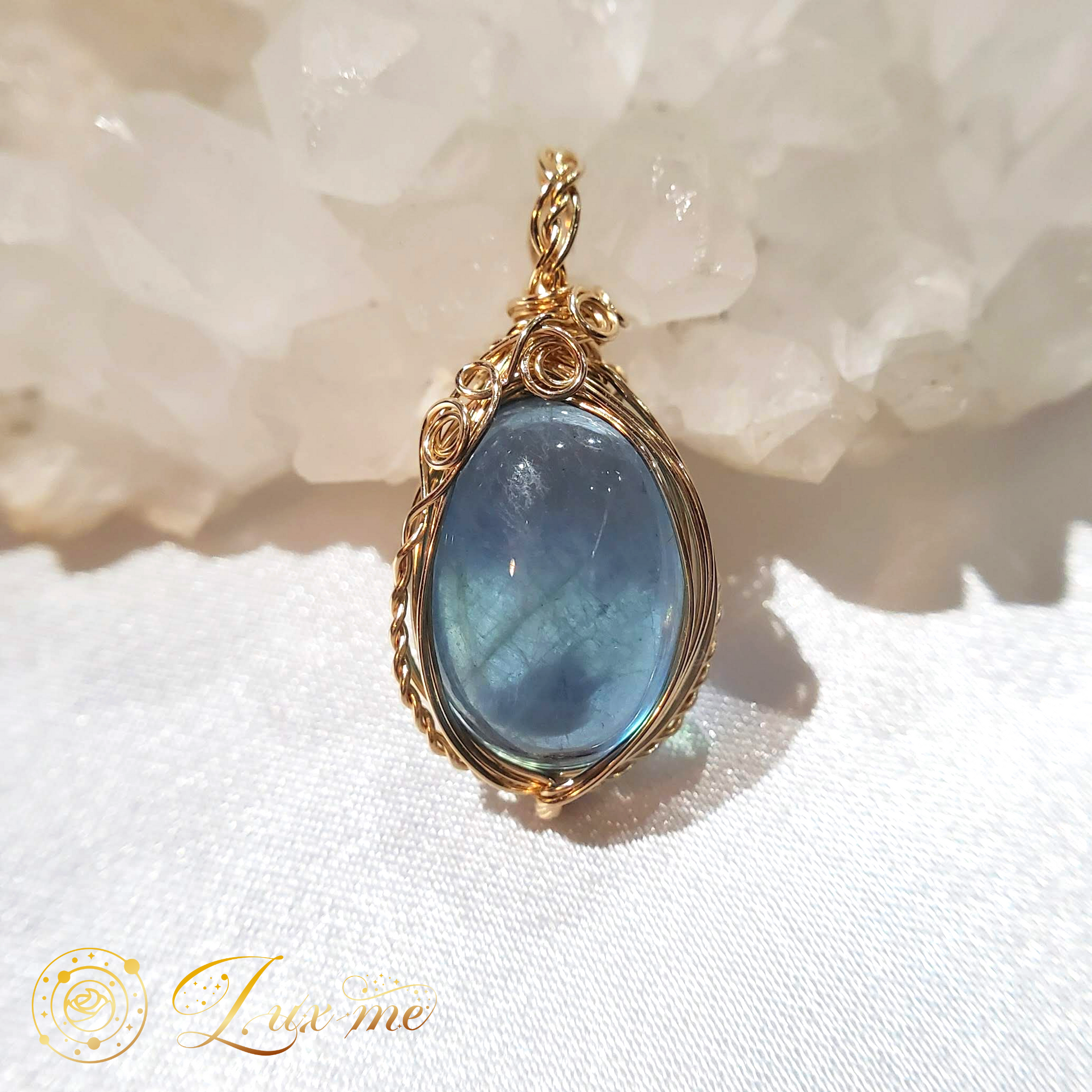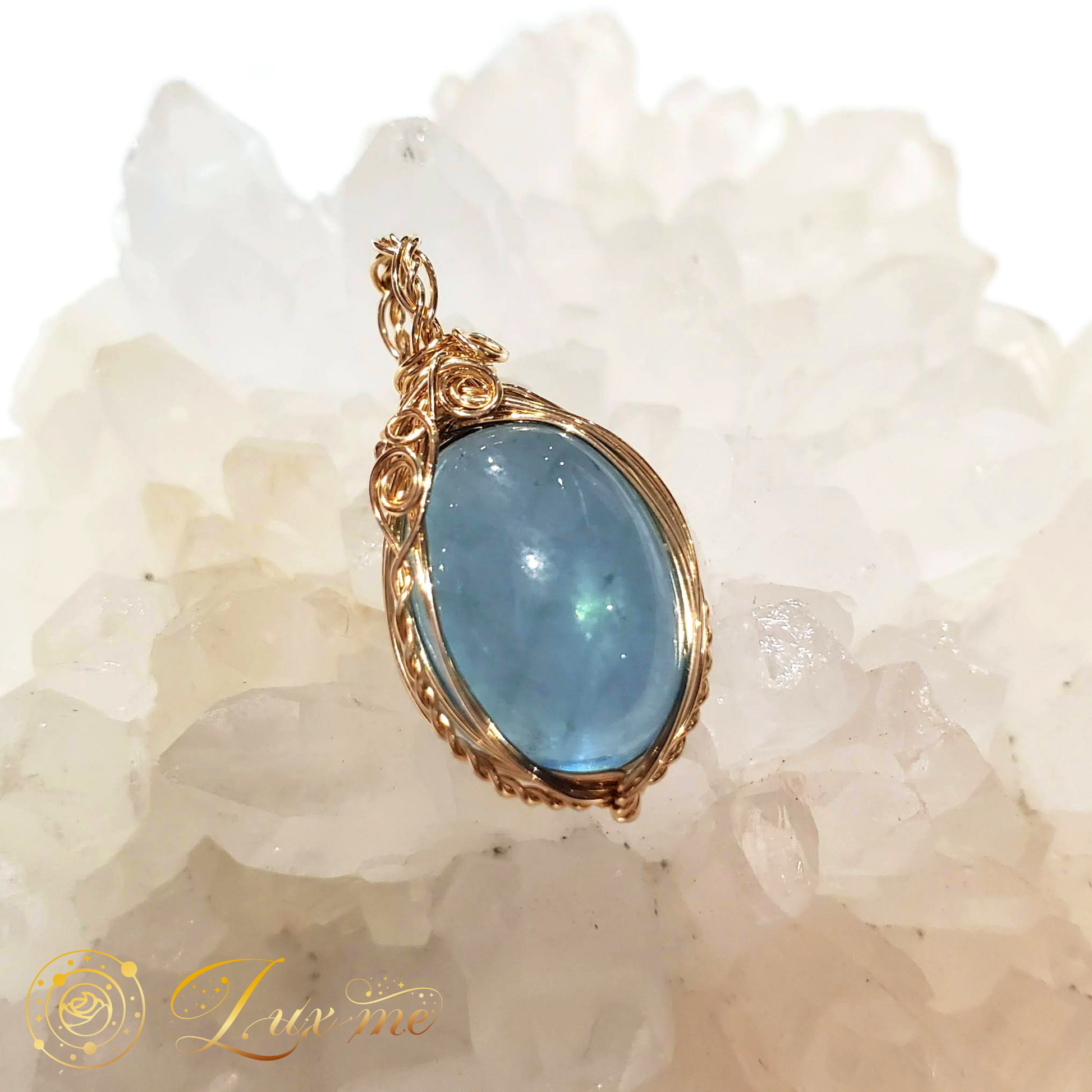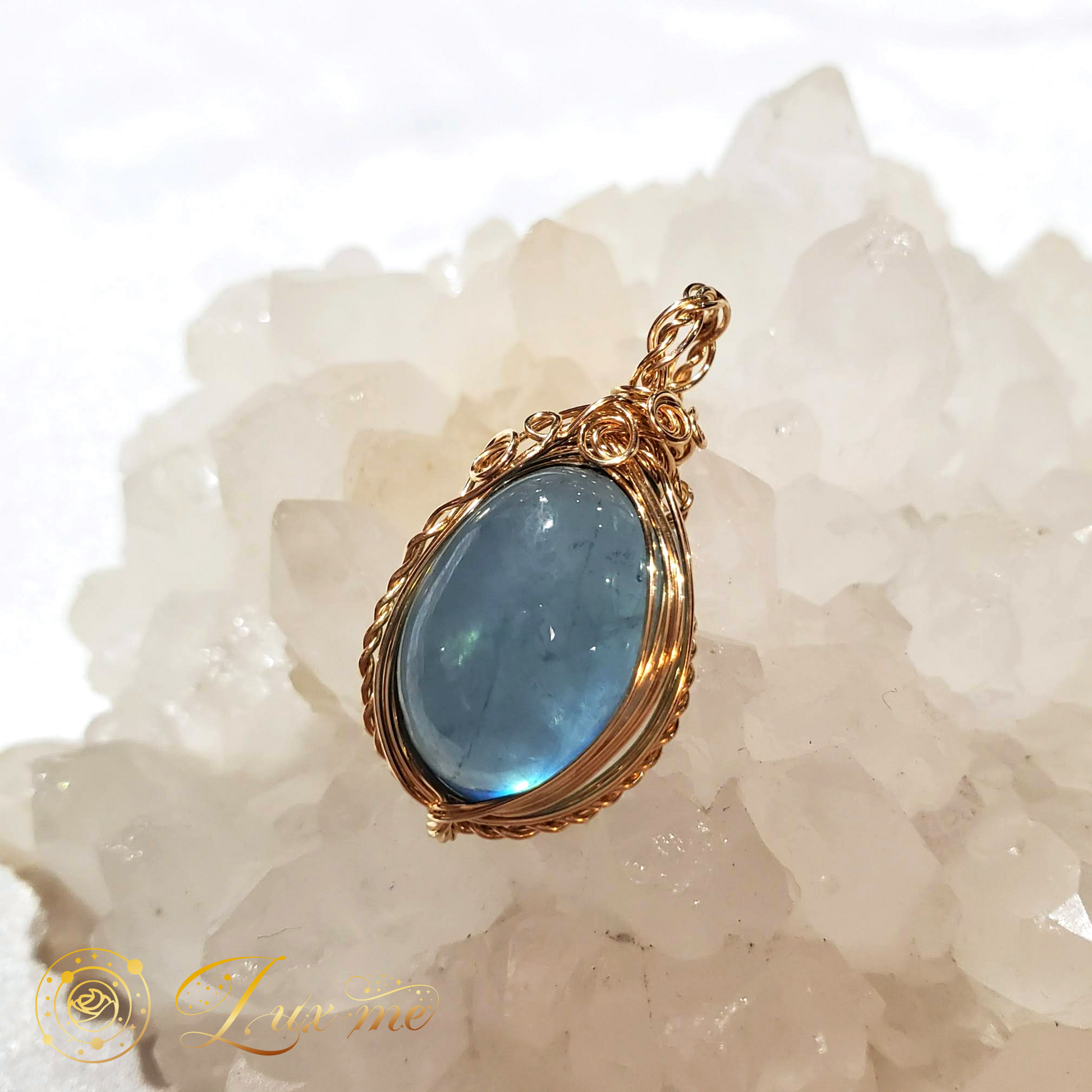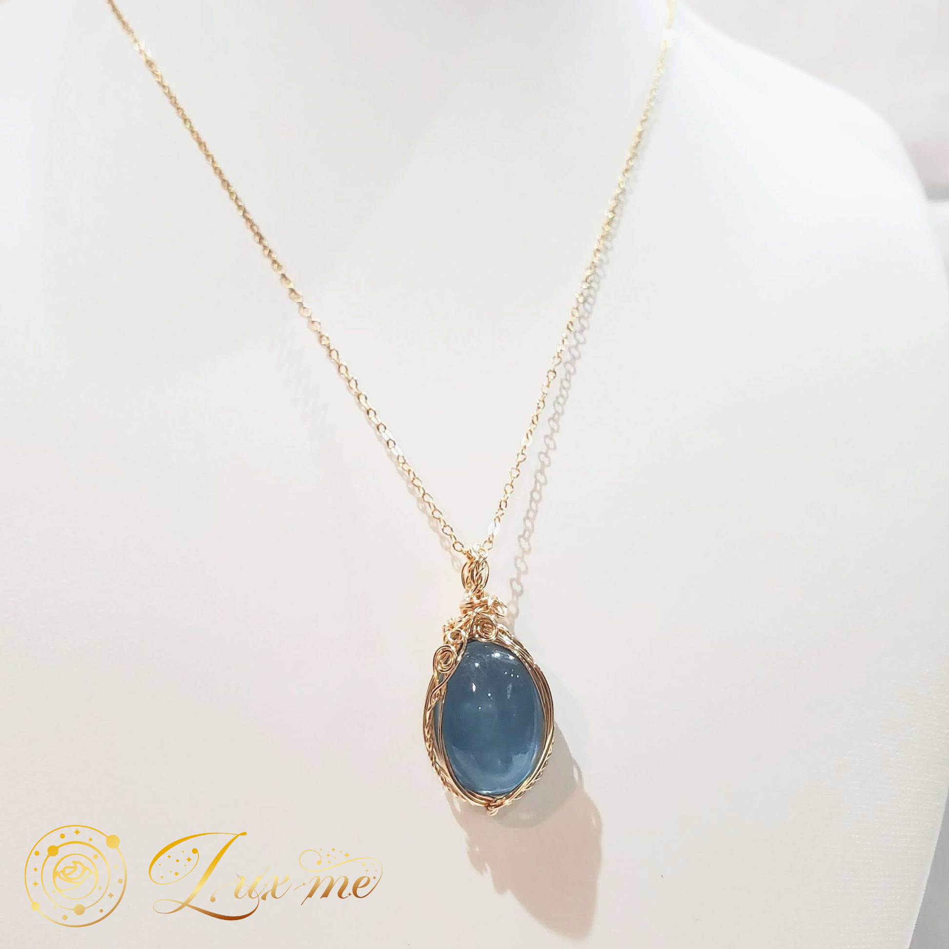 アクアマリンの中でも特に希少で価値の高い深みのあるブルーのオーバルカボションを、14kgfワイヤーで巻きペンダントトップに。まるで海の一滴をそのまま宝石の中に閉じ込めたような、うっとりと魅入ってしまいそうな艶やかさ、瑞々しい透明感溢れるピースを、海の泡をイメージさせるようなラグジュアリーなデザインで彩りました。