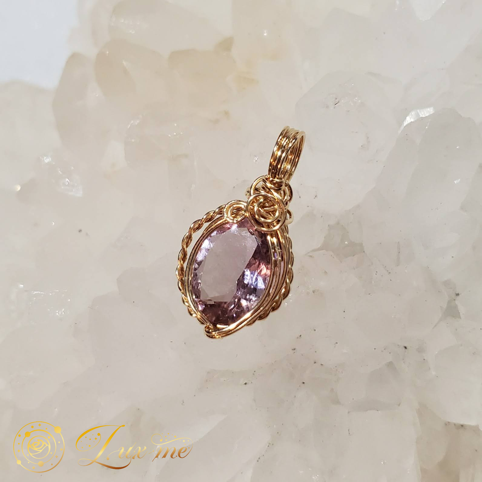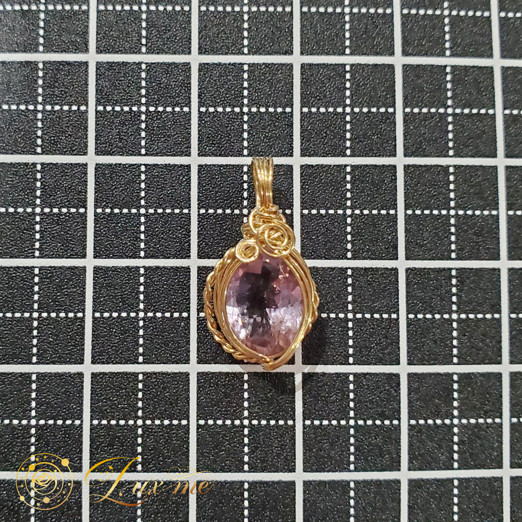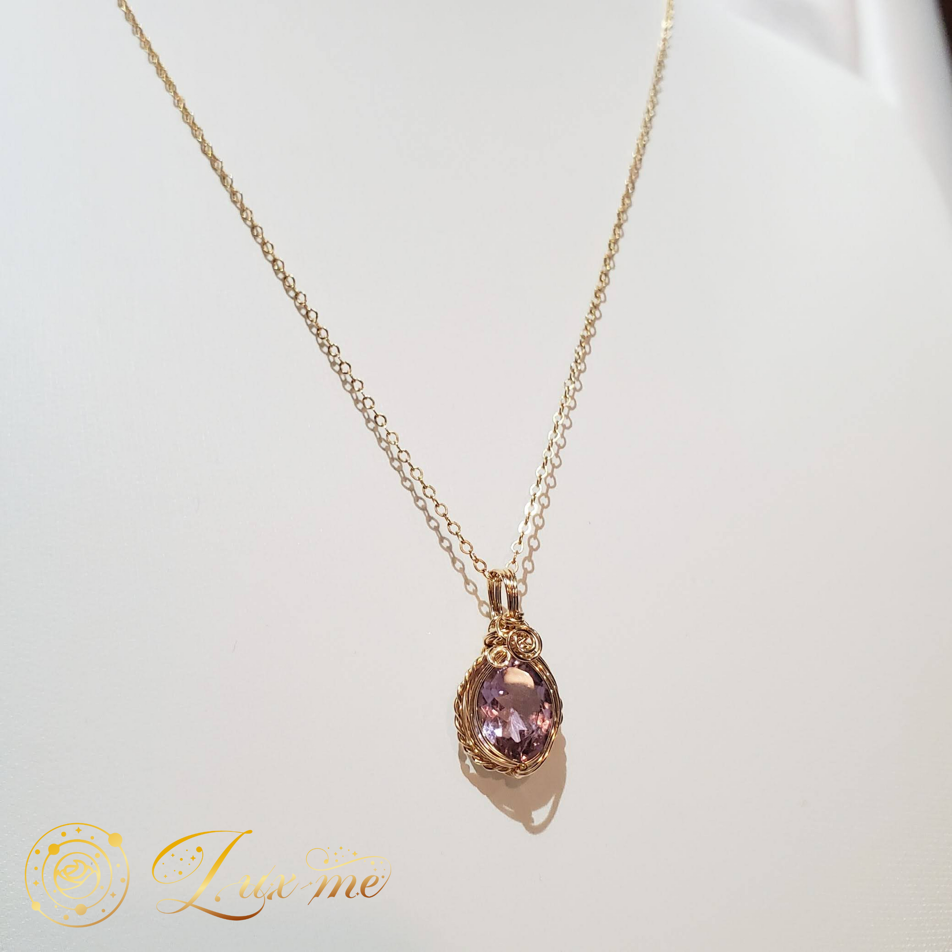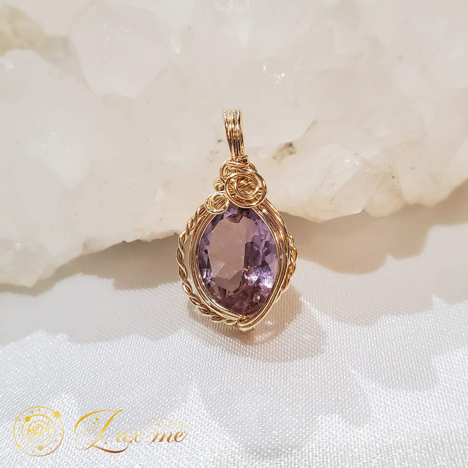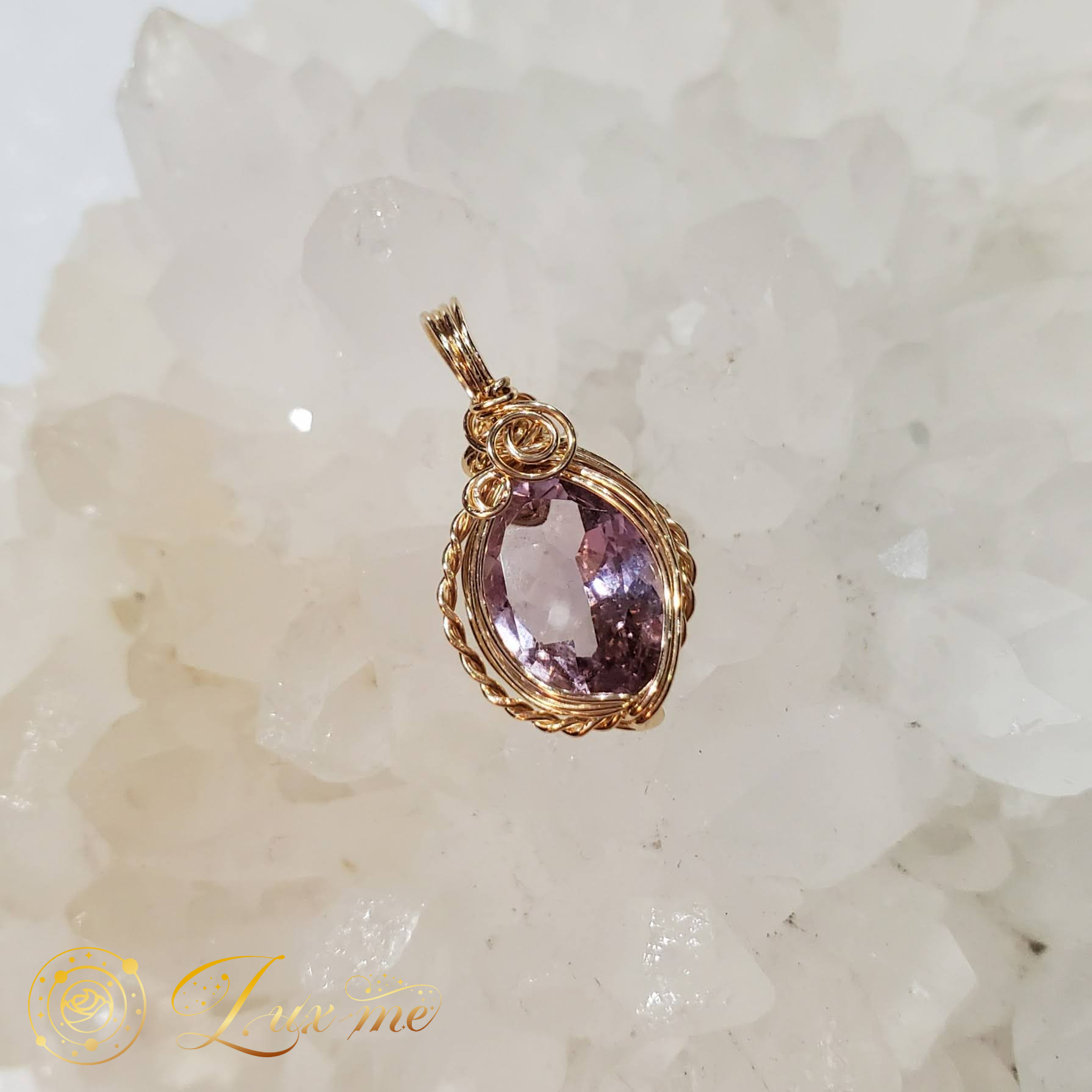アメジストには濃い色から淡い色まで様々な紫の色合いが存在しますが、その中でもピンクアメジストと呼ばれる、ピンクがかった明るい紫のカットルースを14kgfワイヤーで巻き、華やかなペンダントトップに。胸元にぱっと可憐で明るい光を呼び込みます。