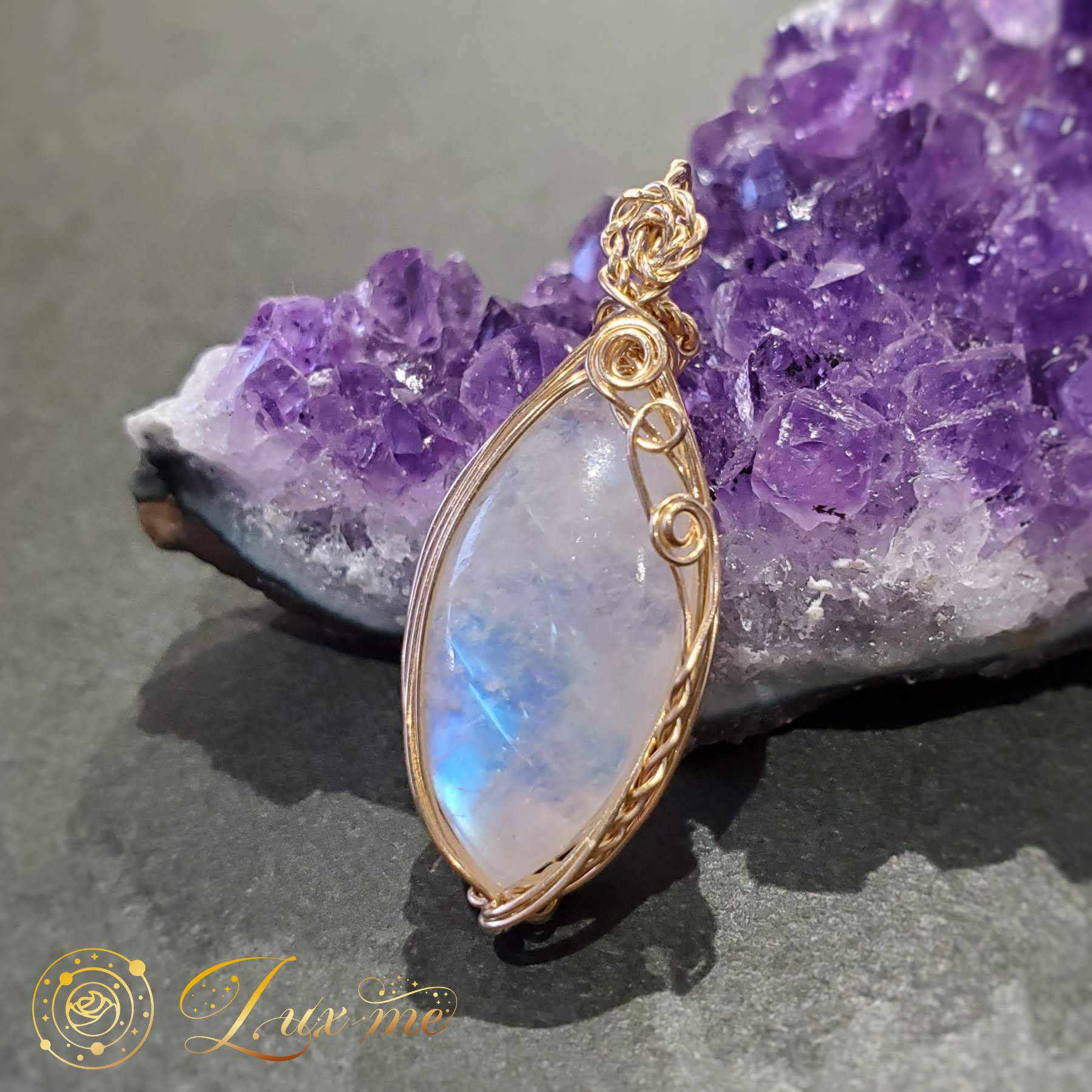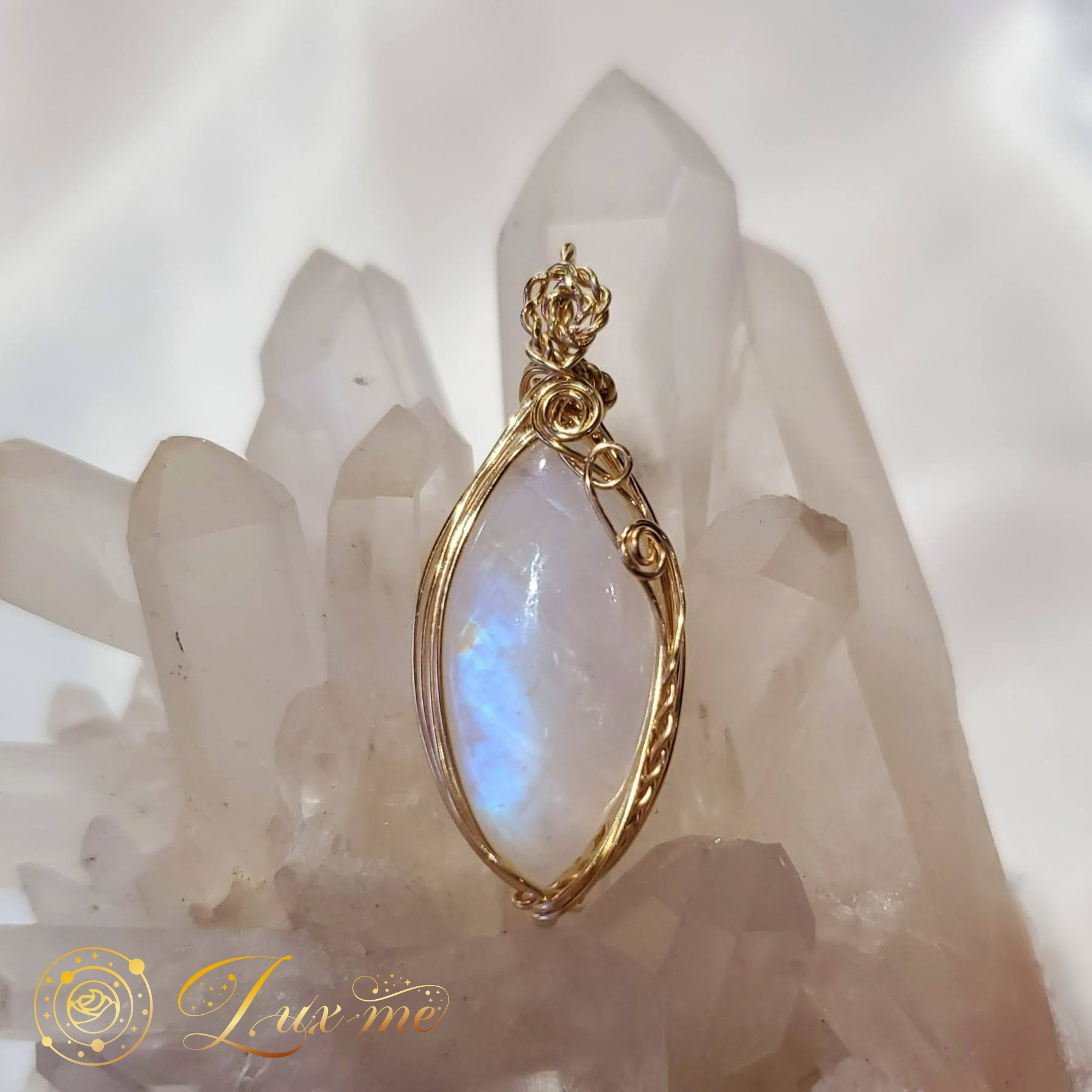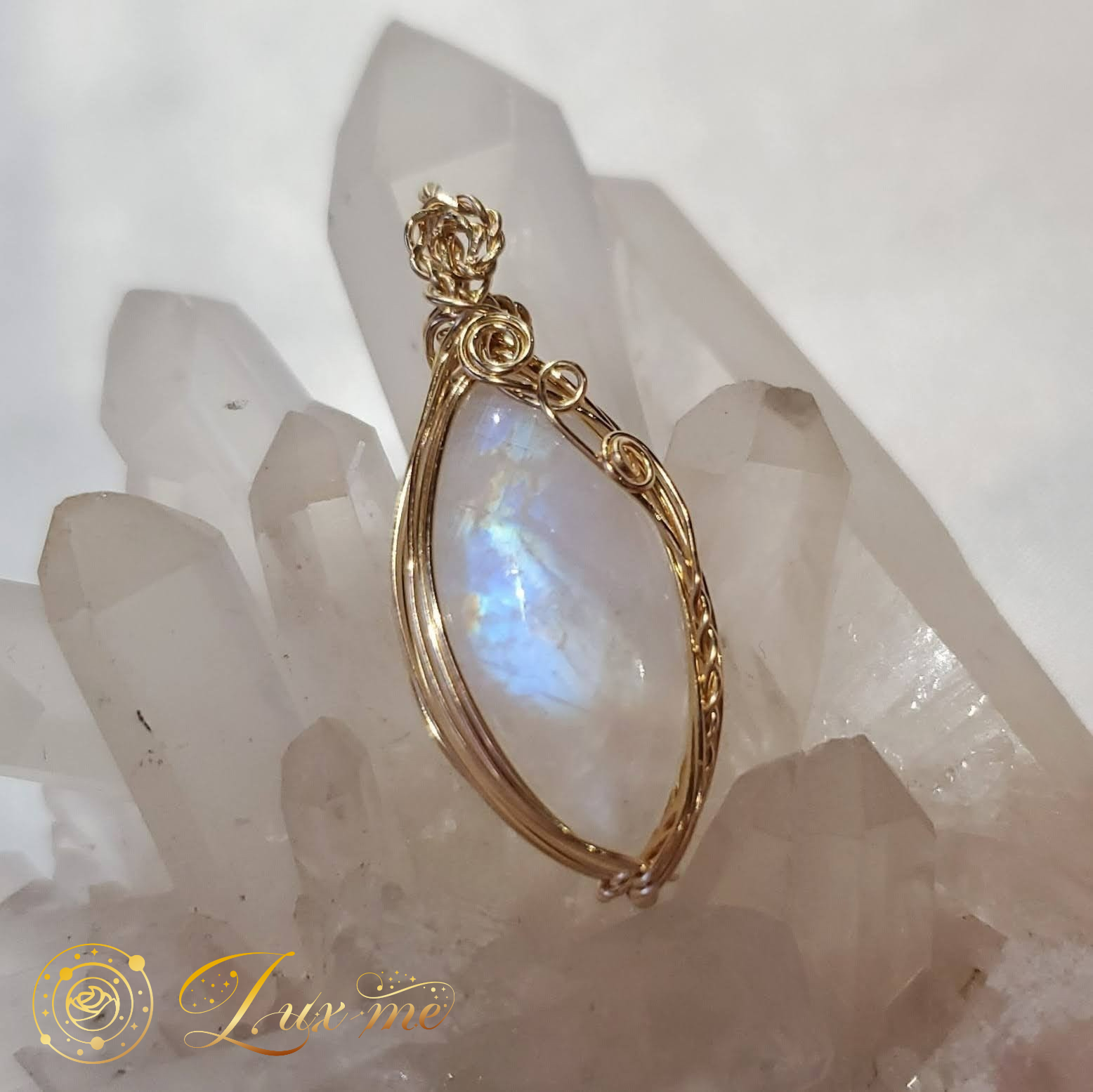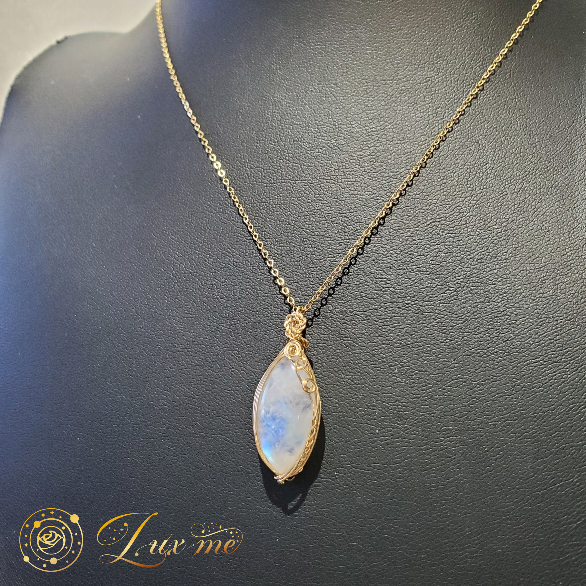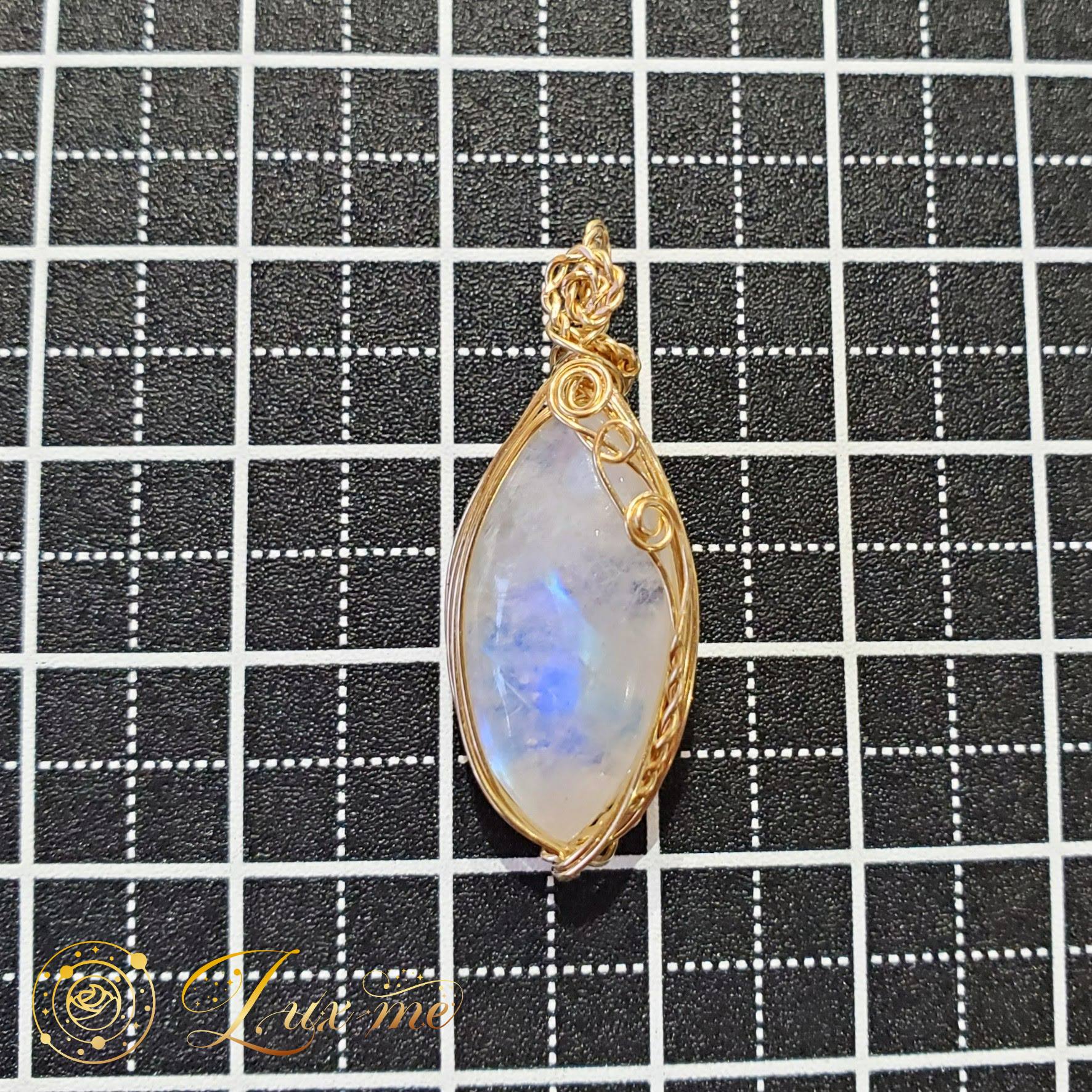 上品なマーキスシェイプ(両端が尖った細長い楕円)のホワイトラブラドライトのカボションを、14kgfワイヤーで巻きペンダントトップに。