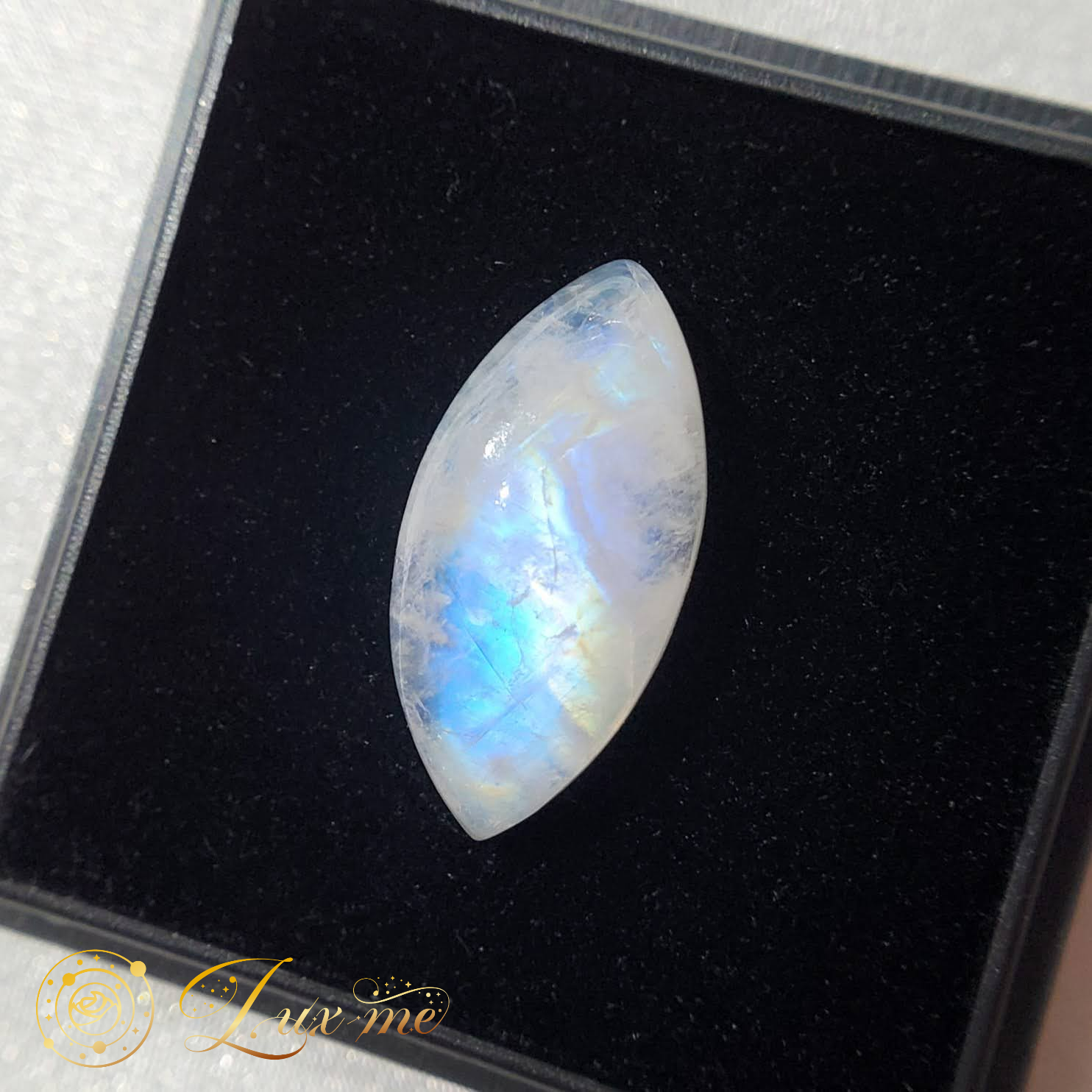 代表的なラブラドライトは、深いブルー系の色味に蝶の羽のような偏光を纏っていることが多いですが、こちらのピースは透明感のあるホワイトのベースに、美しいブルーの偏光が強く輝きを放ちます。