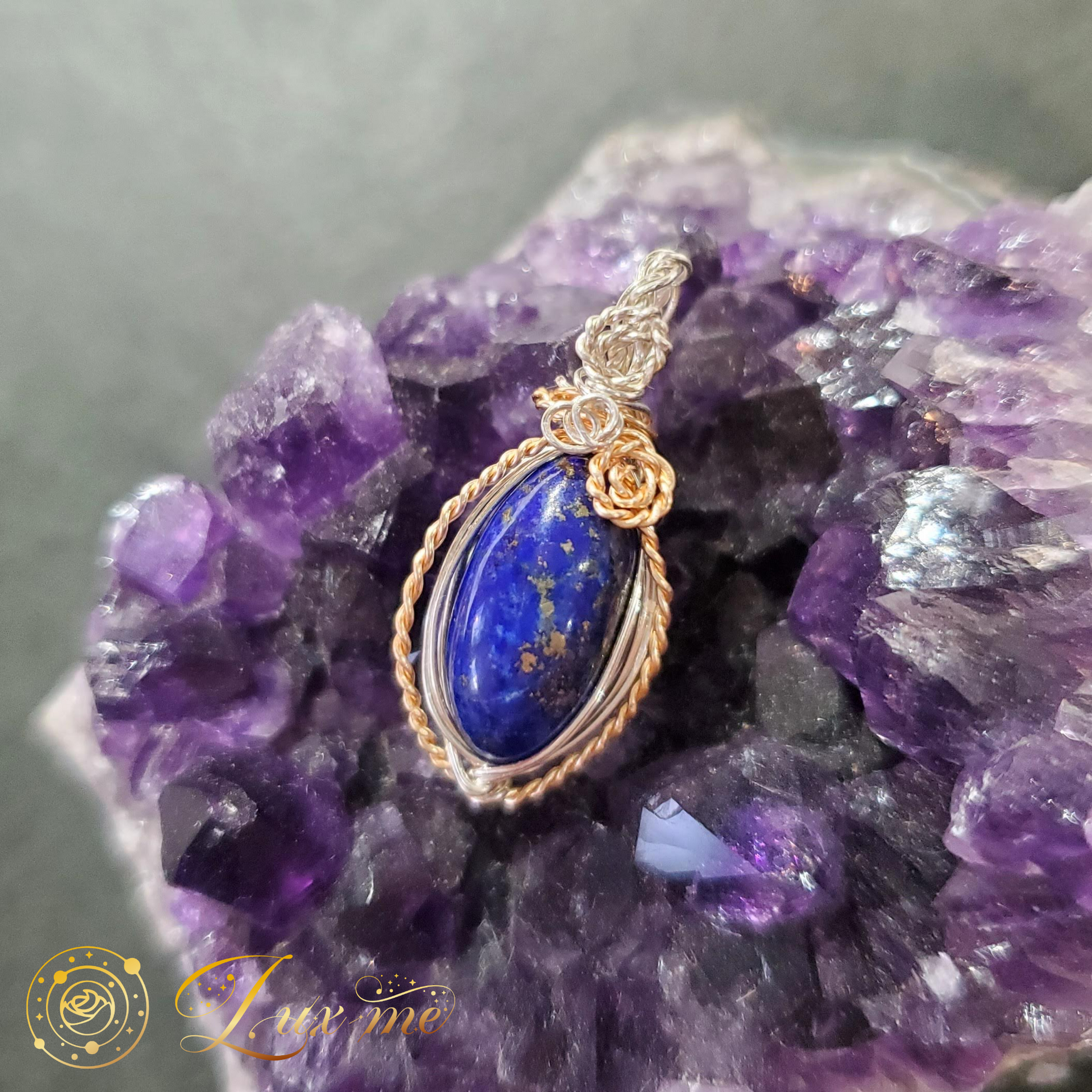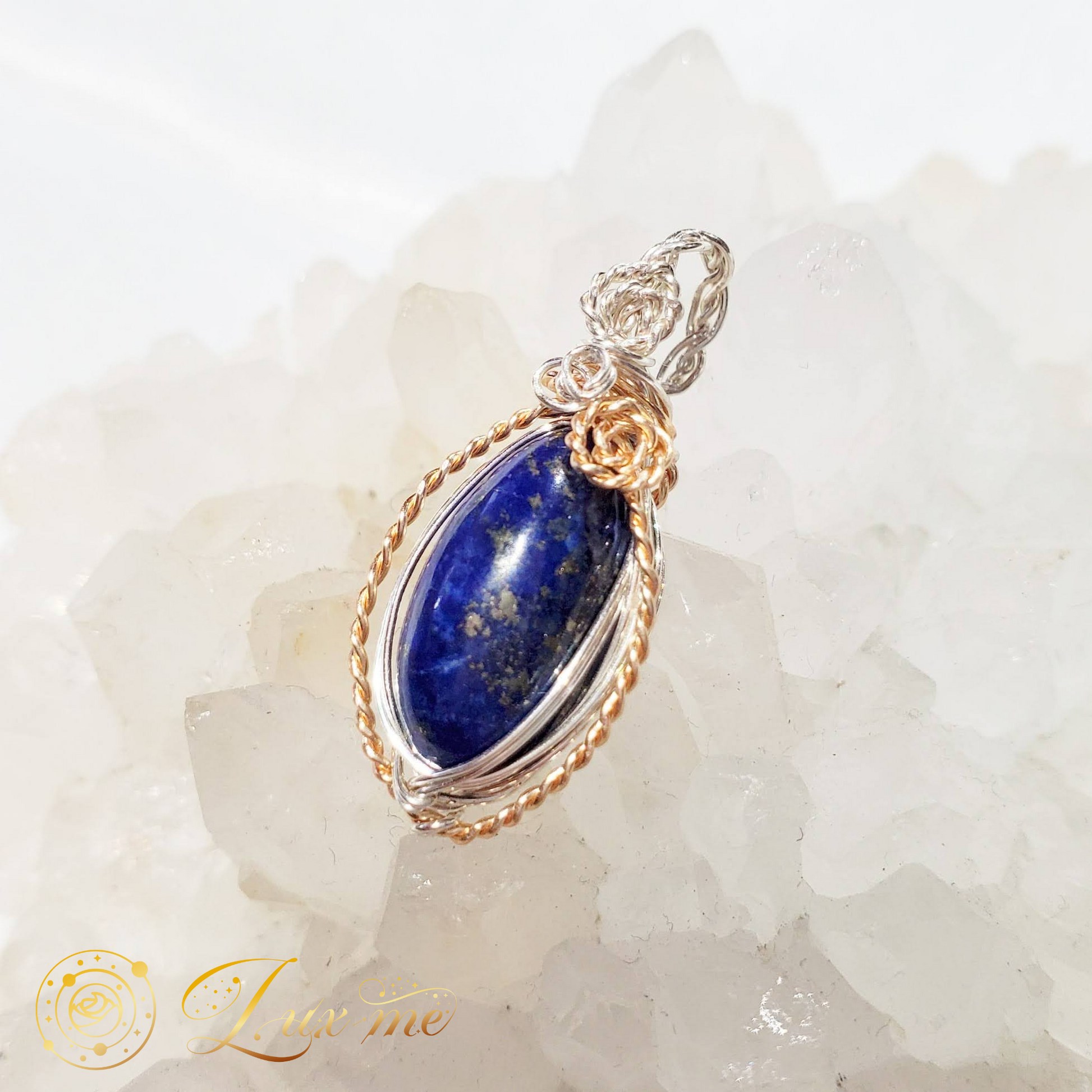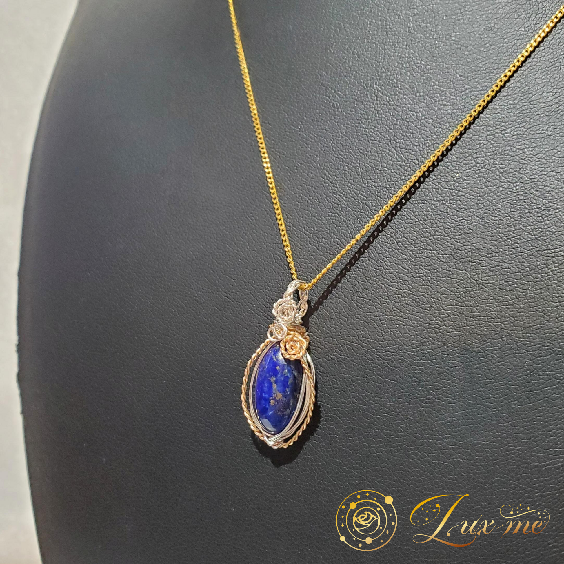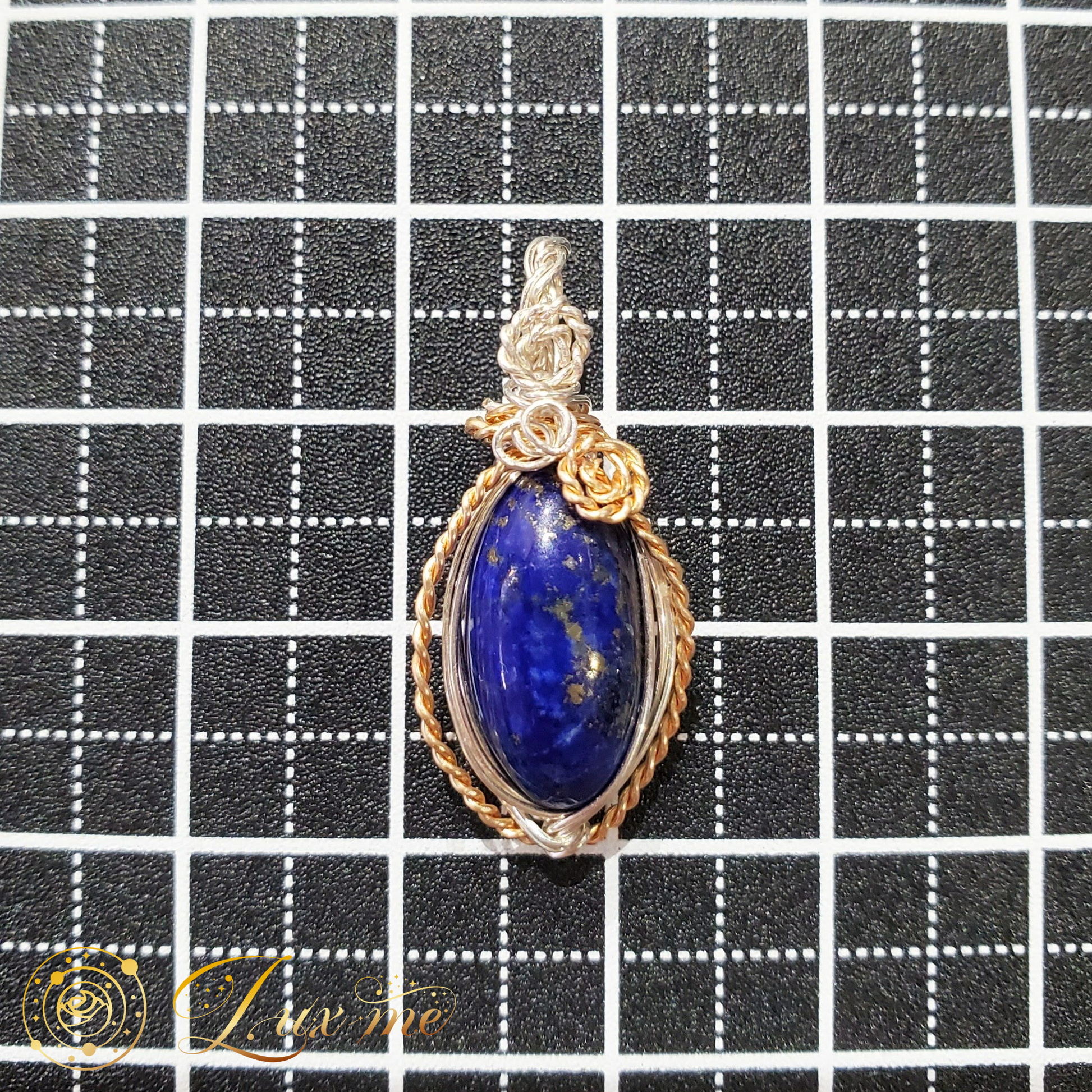 印象的な細長いオーバルシェイプに、ラピスラズリの特徴的な魅力であるパイライトのメタリックな輝きがしっかりとのっている石を選び、ゴールドとシルバー2色のワイヤーで巻いてペンダントトップに。まるで額装された絵画のようなデザインに仕上げました。