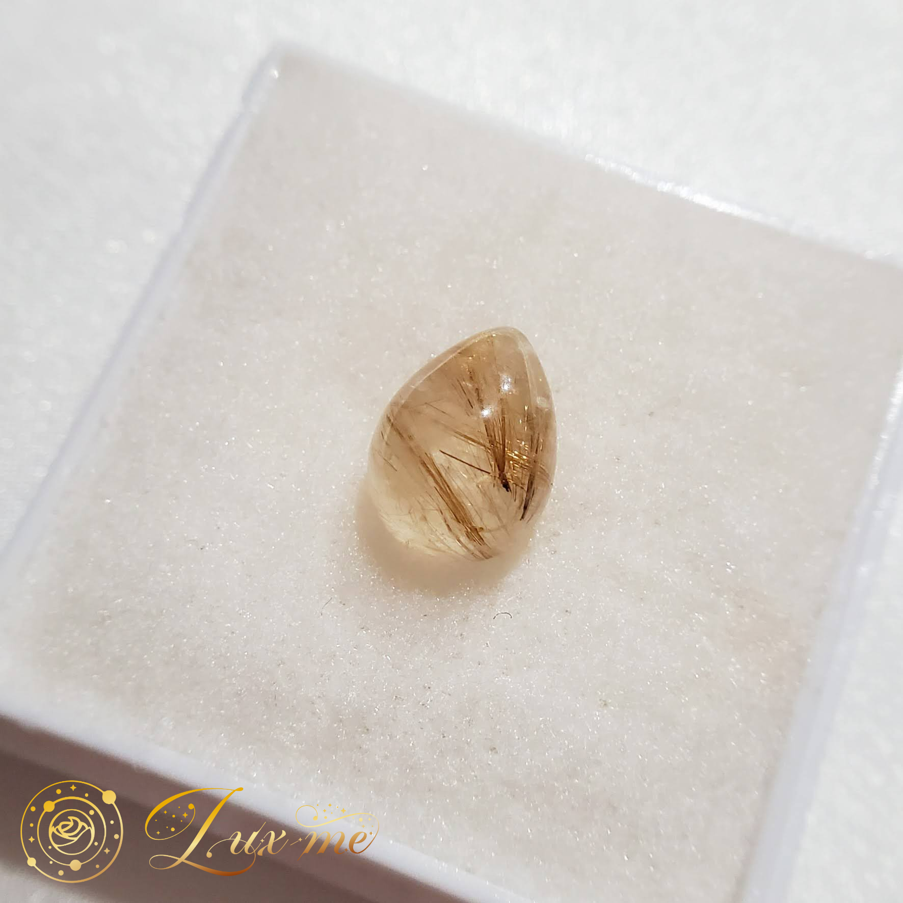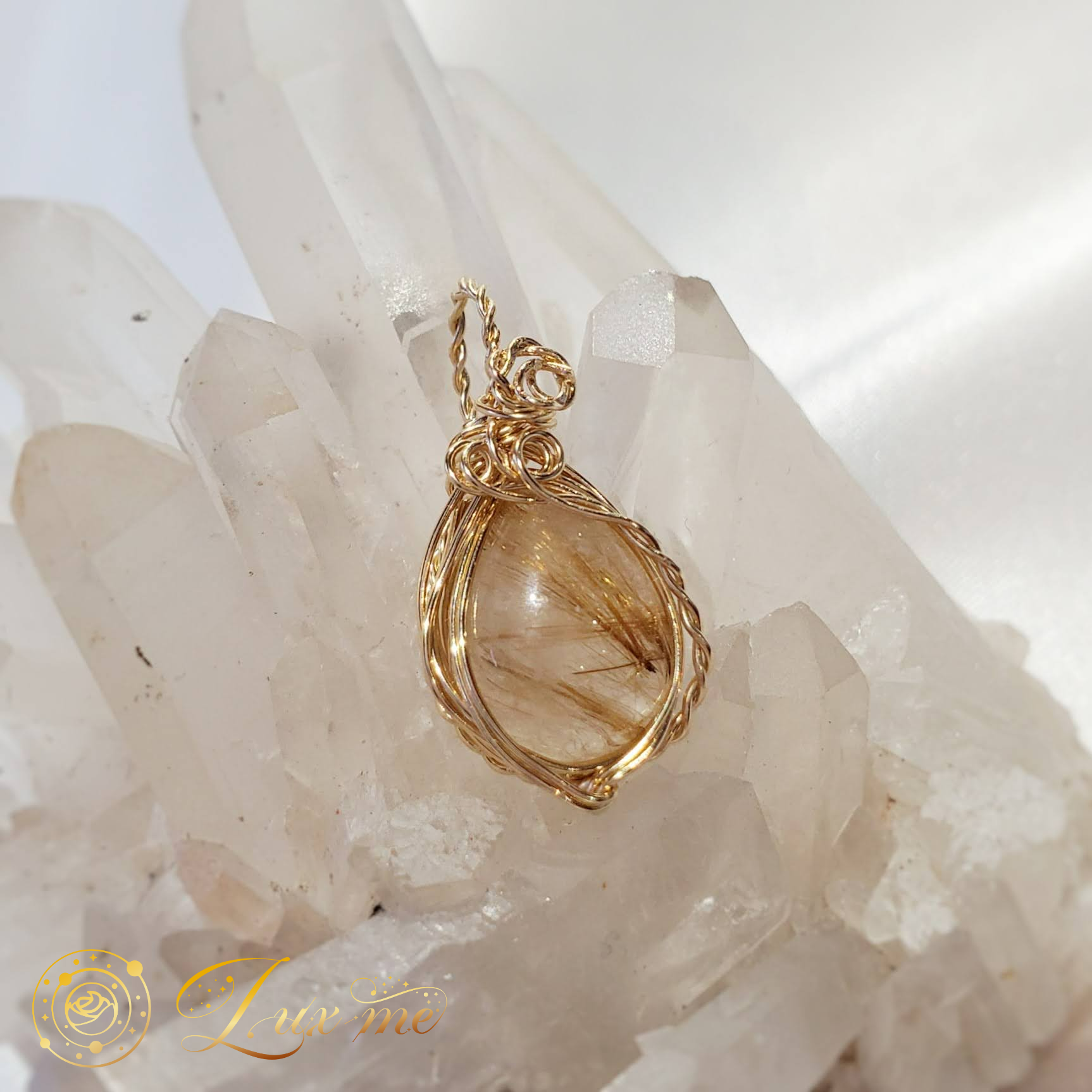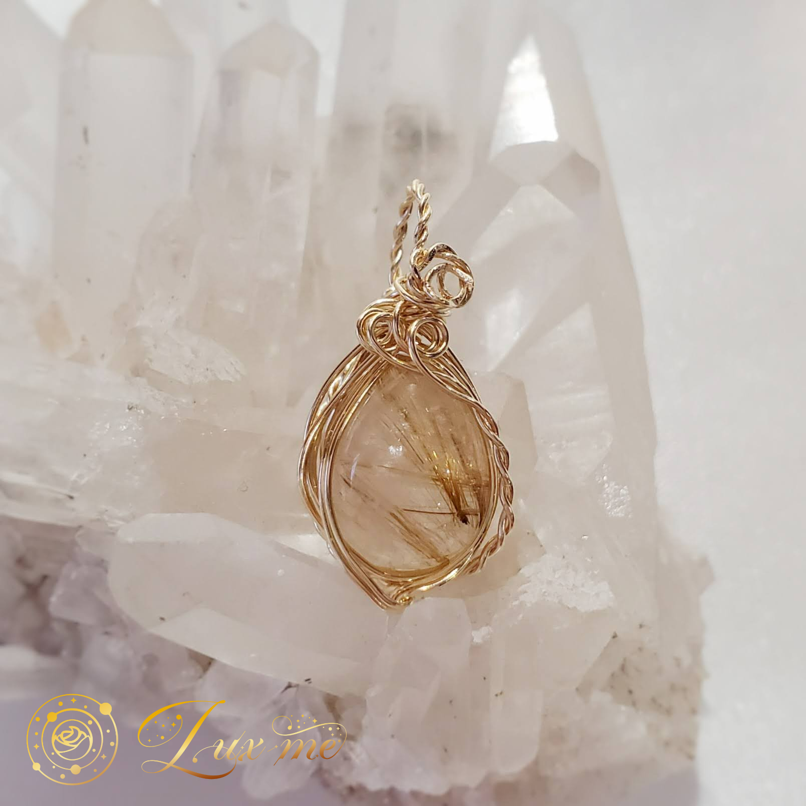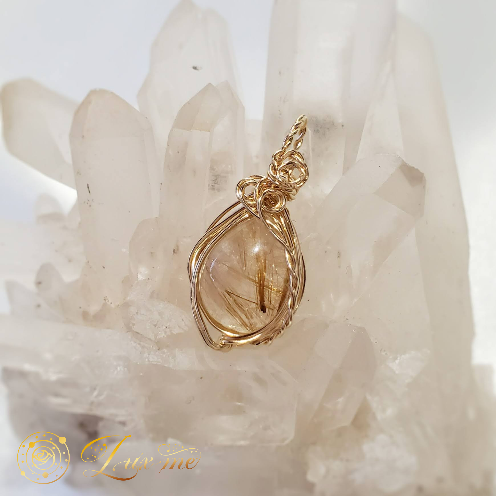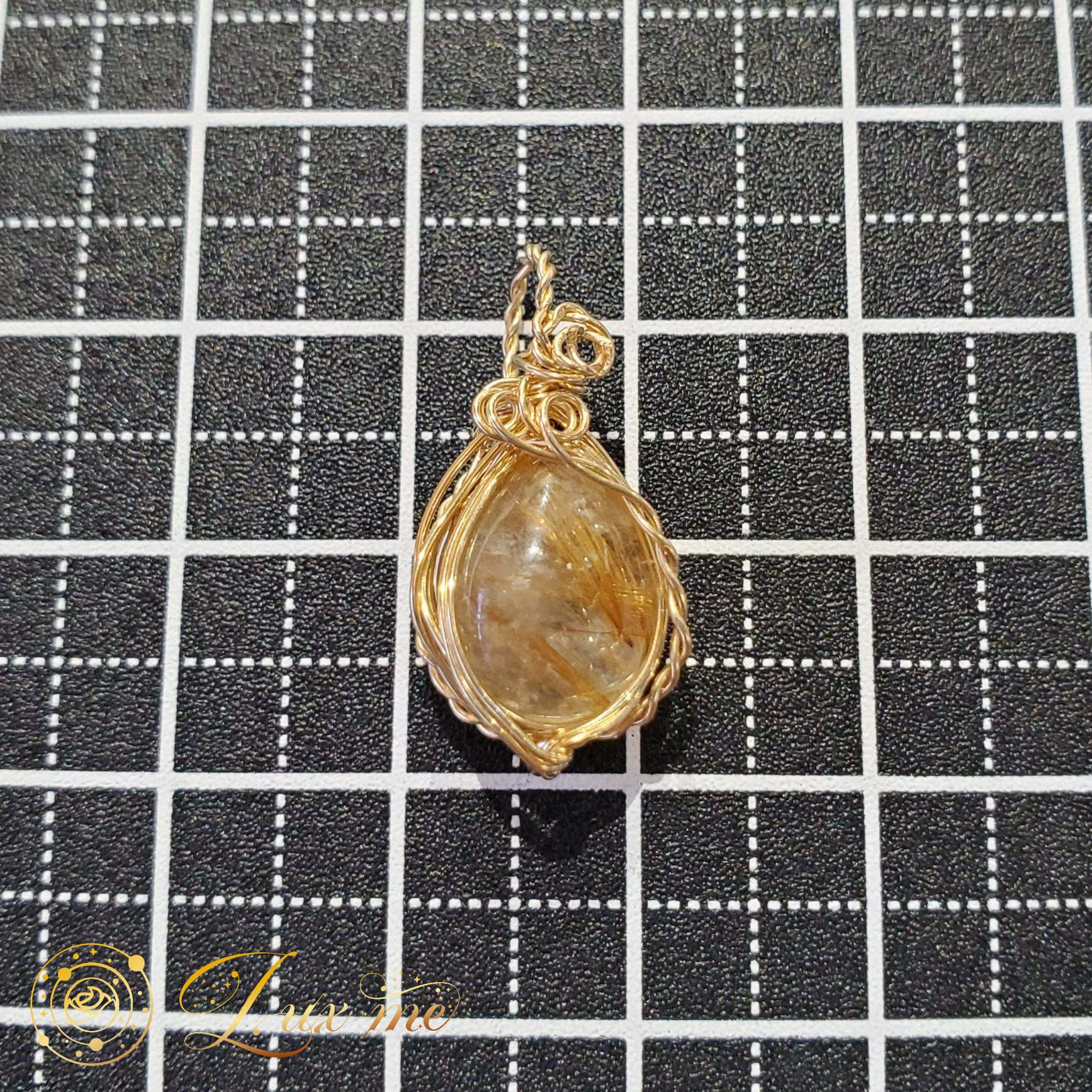 ドロップシェイプ(雫型)のルチルクォーツのカボションの中に、バランスよく存在感のあるゴールドの針が散りばめられているピースを選び、14kgfワイヤーで巻いてエレガントなペンダントトップに。